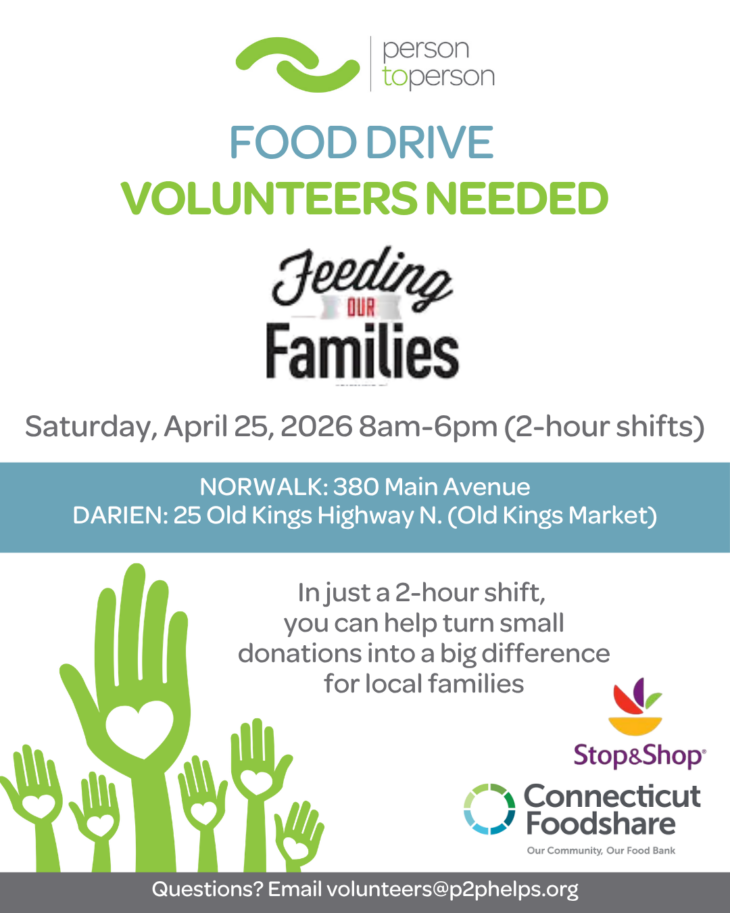 P2P will be the beneficiary of the Feeding Our Families Food Drive at four Stop & Shop locations on Saturday, April 25 from 8am – 6pm. Please visit and make a donation or click to sign up and volunteer to collect and sort food donations.